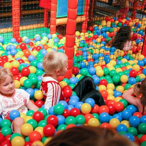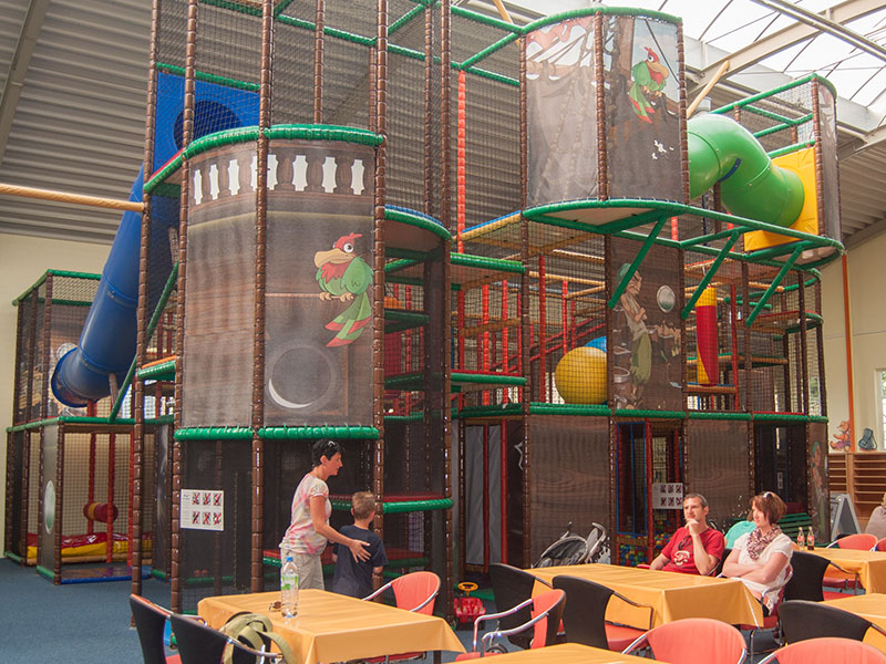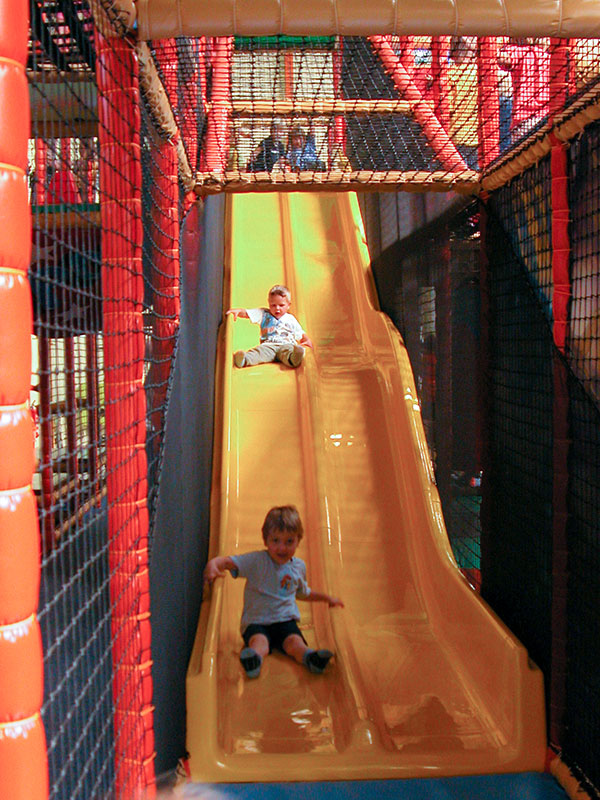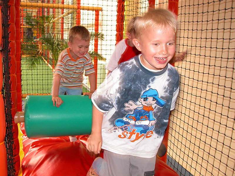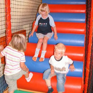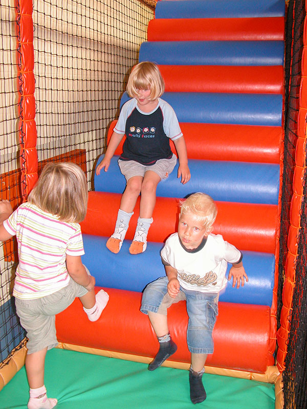Das Herzstück in der Spielscheune ist ein riesiges Kletterlabyrinth. In drei Etagen können sich die Kinder spielend, kletternd und rutschend durch diese Anlage bewegen.