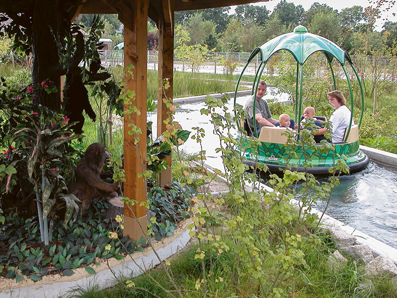Ein langer Strömungskanal zieht sich wellenförmig durch die Landschaft. Nur durch die Bewegung des Wassers angetrieben, gleiten blütenförmige Rundboote wie bei einer Flussfahrt an lustigen Spielszenen aus Mowglis Leben im Dschungel vorbei.