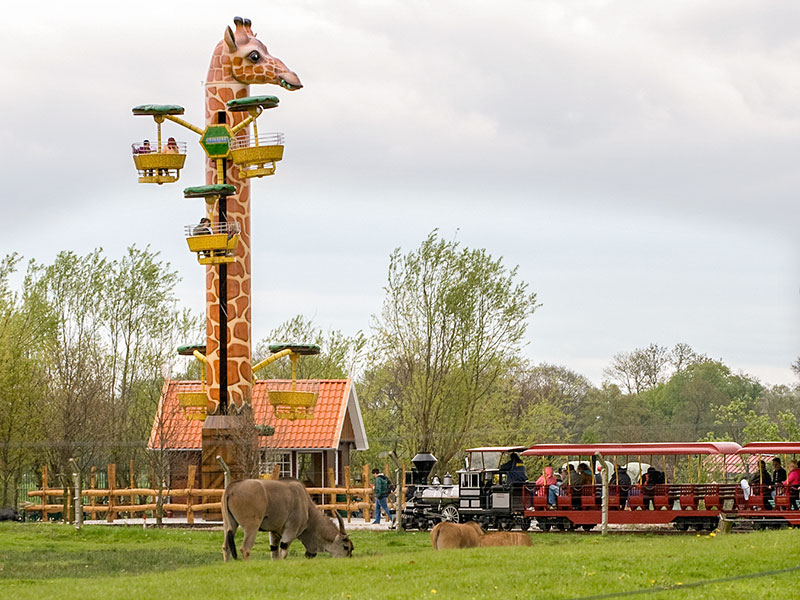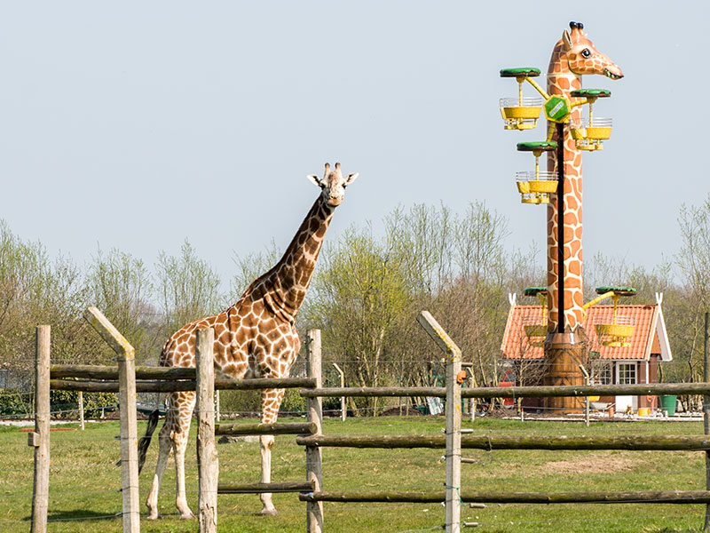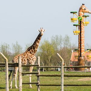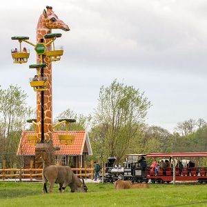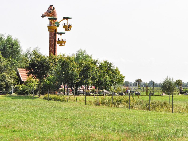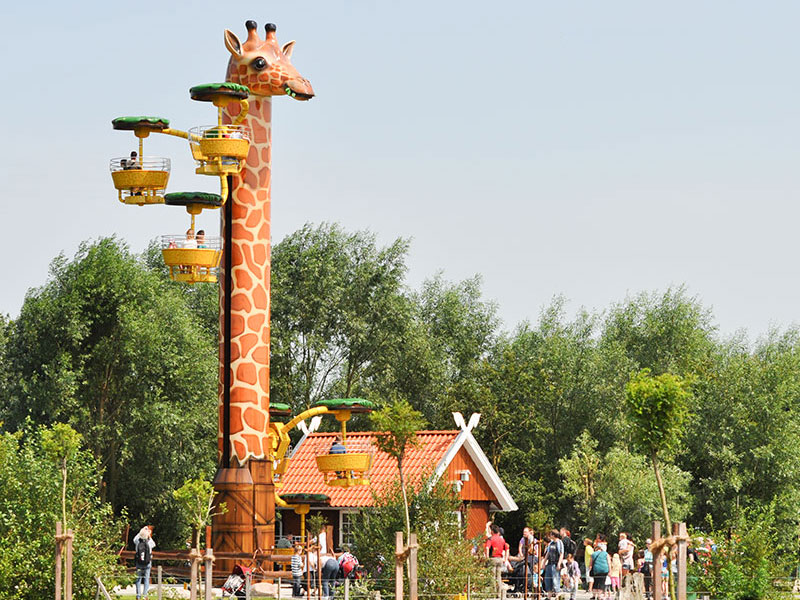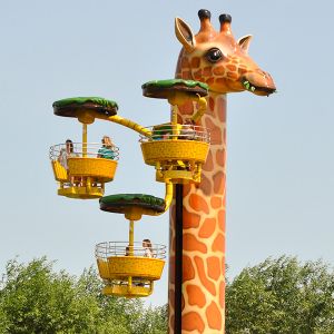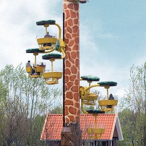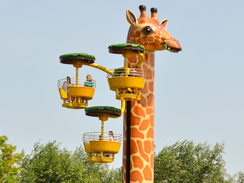 Bei der Fahrt in 16 Meter Höhe dreht sich nicht nur die Giraffe um ihre Achse, sondern zusätzlich auch die Gondeln in drei verschiedenen Ebenen. Da dies jedoch sehr gemächlich passiert, ist ein wunderschöner Rundblick über die Afrika-Anlage zu Giraffen, Zebras und Straußen sowie den gesamten Park garantiert. Knapp ½ Mio. Euro investierte Fam. Ludewigt in diese weltweit einzigartige Neuheit, denn im Erscheinungsbild „Hungrige Giraffe“ kann man dieses „Flying Wheel“ (Turmfahrgeschäft) nur im Jaderpark erleben. Jetzt bemühen wir uns um einen Eintrag ins Guinnessbuch der Rekorde für die längste Giraffe der Welt.