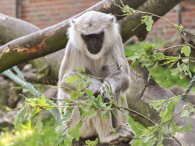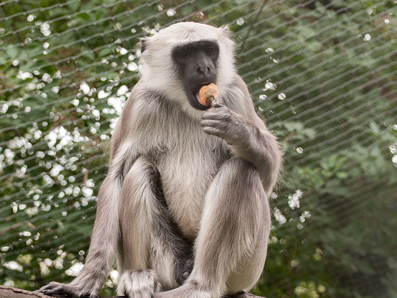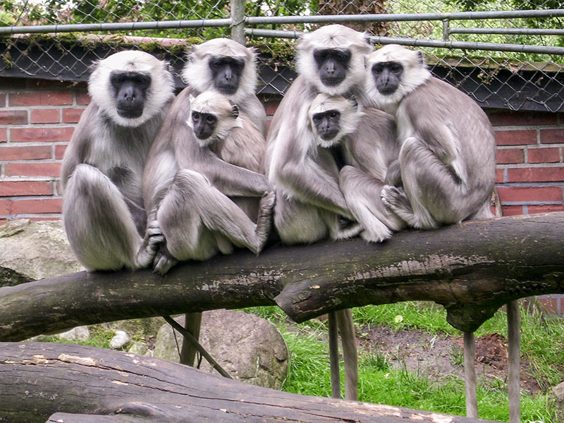 Hanumans leben in Haremsfamilien mit strenger Rangordnung zusammen. Im Tiergarten muss bei der Pflege natürlich gut darauf geachtet werden, dass die Futterplätze so angelegt sind, dass auch rangniedere Tiere ihre Malzeit bekommen. Bei uns leben 3 Weibchen mit einem Männchen zusammen. Auch hier ist es möglich durch große Scheiben in den Innenraum zu schauen.