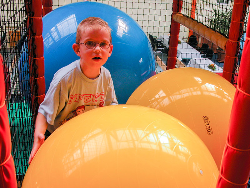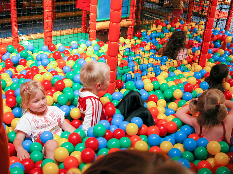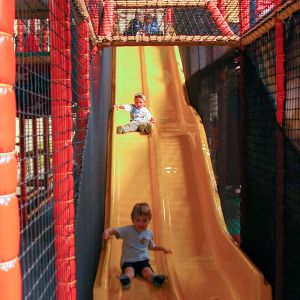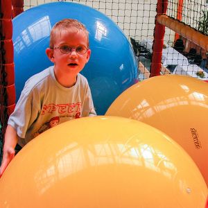 Das Herzstück in der Spielscheune ist ein riesiges Kletterlabyrinth. In drei Etagen können sich die Kinder spielend, kletternd und rutschend durch diese Anlage bewegen.