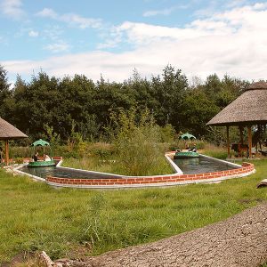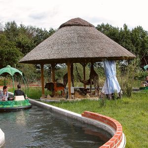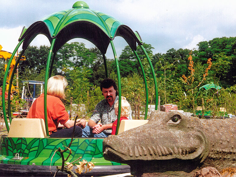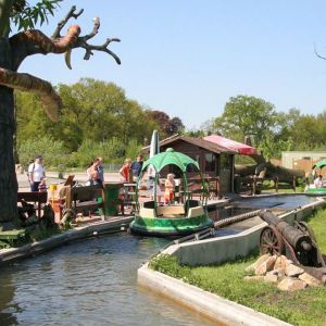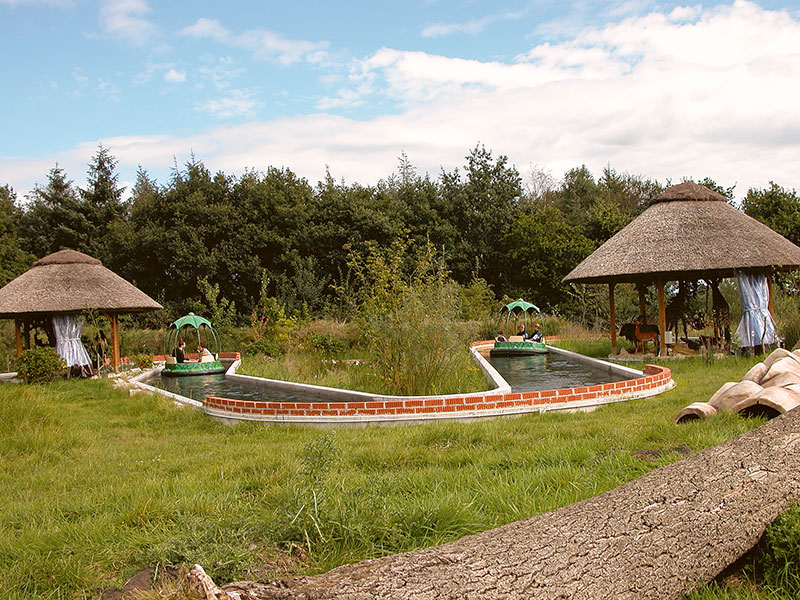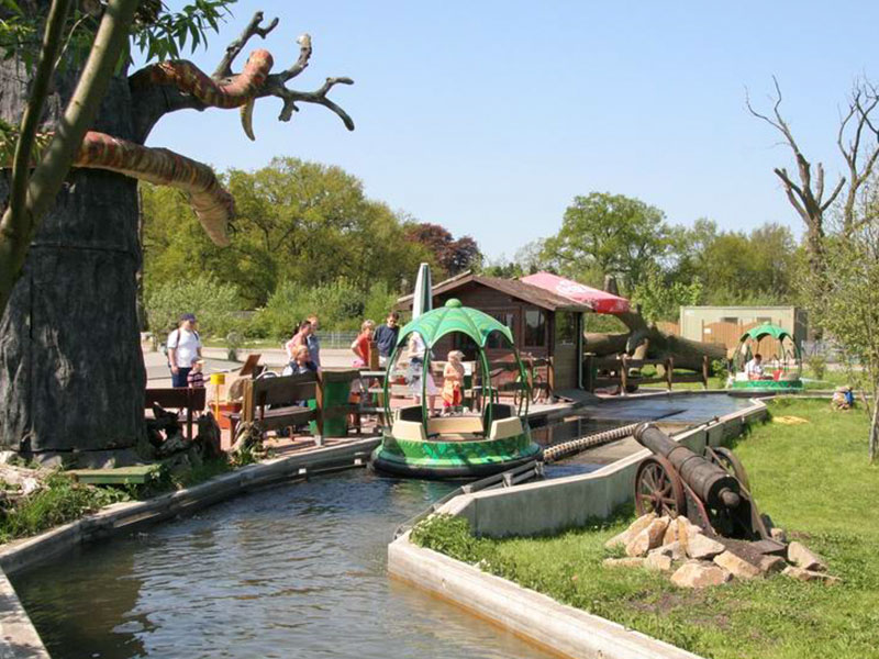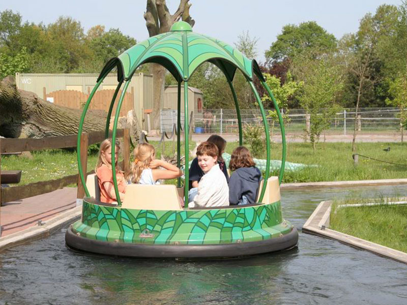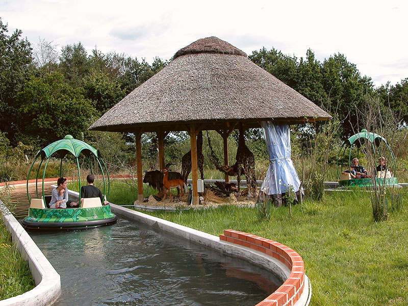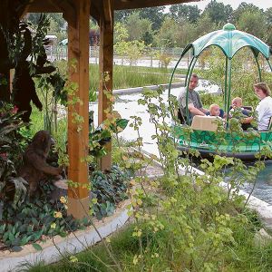 Ein langer Strömungskanal zieht sich wellenförmig durch die Landschaft. Nur durch die Bewegung des Wassers angetrieben, gleiten blütenförmige Rundboote wie bei einer Flussfahrt an lustigen Spielszenen aus Mowglis Leben im Dschungel vorbei.