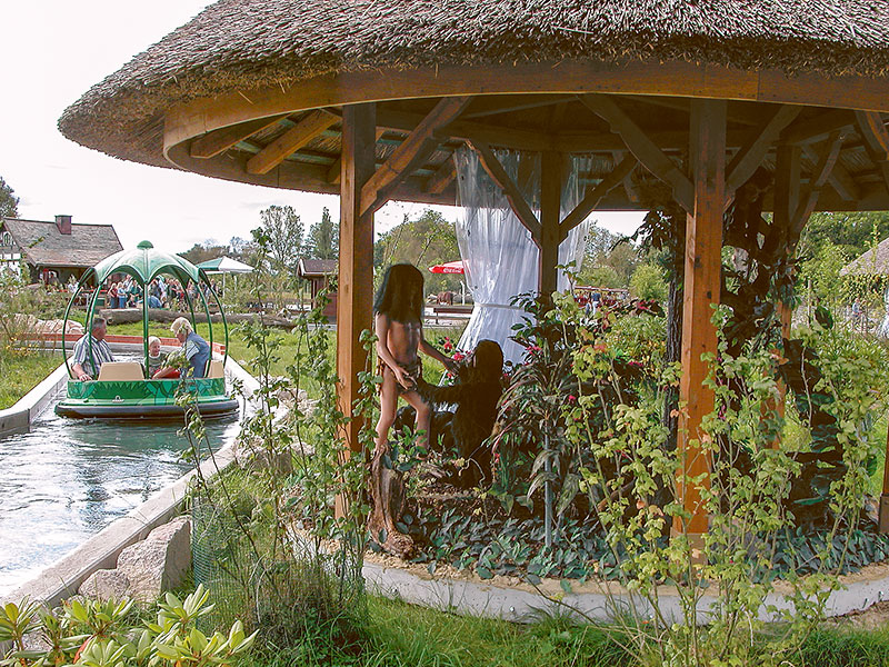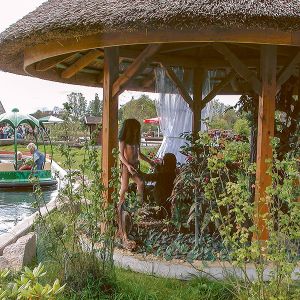 Wenn man nach einem kleinen Spaziergang bei unseren Rundbooten angekommen ist, wartet während der Fahrt durch den Strömungskanal eine nette Abwechslung. In strohgedeckten Pavillons laufen kleine Spielszenen zum Thema "Mowglis Dschungelbuch".